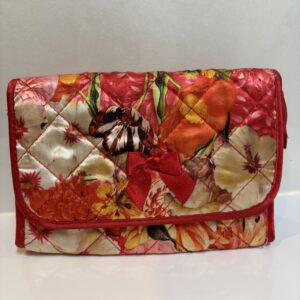自立するポーチ。開くと蓋部分に鏡がついています。このサテン生地が「THE・NaRaYa」!