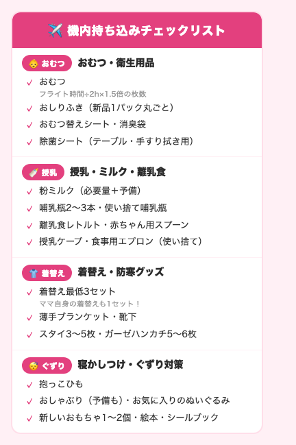 赤ちゃん連れの国際線は、準備さえしっかりすれば怖くありません。最後に、持ち物リストをおさらいしておきましょう。
