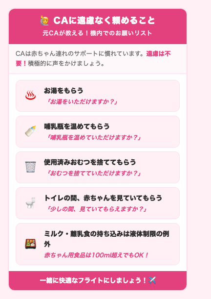 CAはお子様連れのお客様のお手伝いに慣れています。遠慮せずに声をかけてくださいね。一緒に快適なフライトにしましょう!