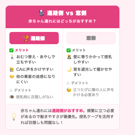 といったメリットがあります。窓側は授乳時の目隠しになるメリットがありますが、頻繁に立つ必要がある赤ちゃん連れには通路側が便利ですよ。